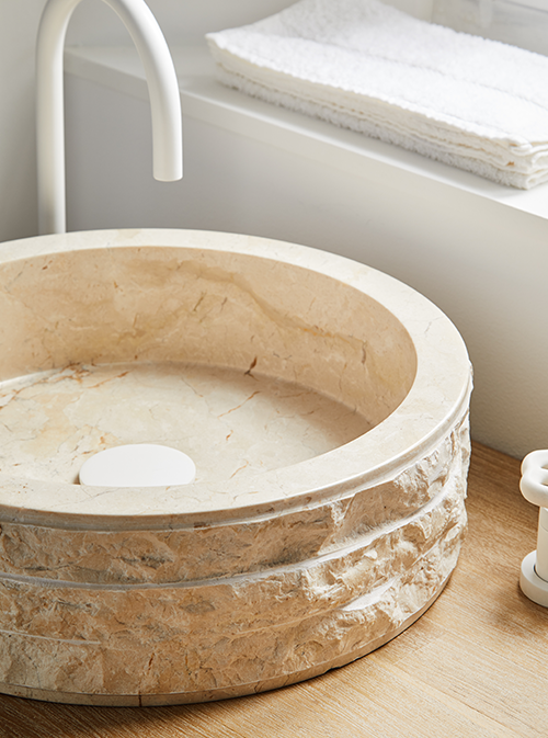 Traditionally cut marble washbasin. 100% natural stone. The exterior is striated, and the interior is smooth. Noble and durable material. Drilling to European standards.